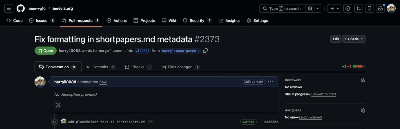 Finally, you can request a PR from your fork to the current branch of the upstream ieee-vgtc/ieeevis.org repository (e.g., “ieee-vgtc/ieeevis.org:vis2026” from “yelper/ieeevis.org:master”).